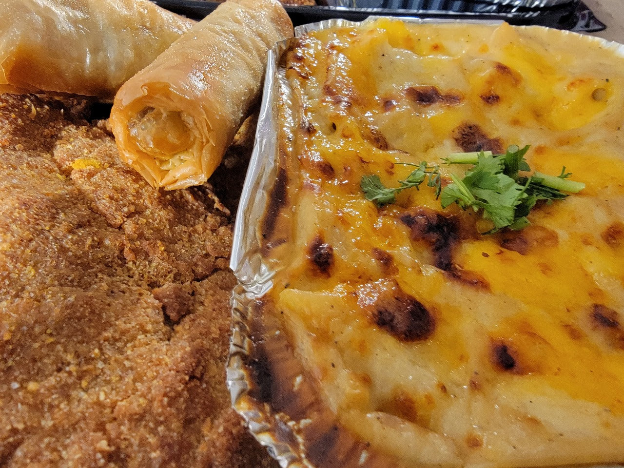 مكرونة بشاميل مع 2 اسكالوب بانيه مع 2 جلاش رول